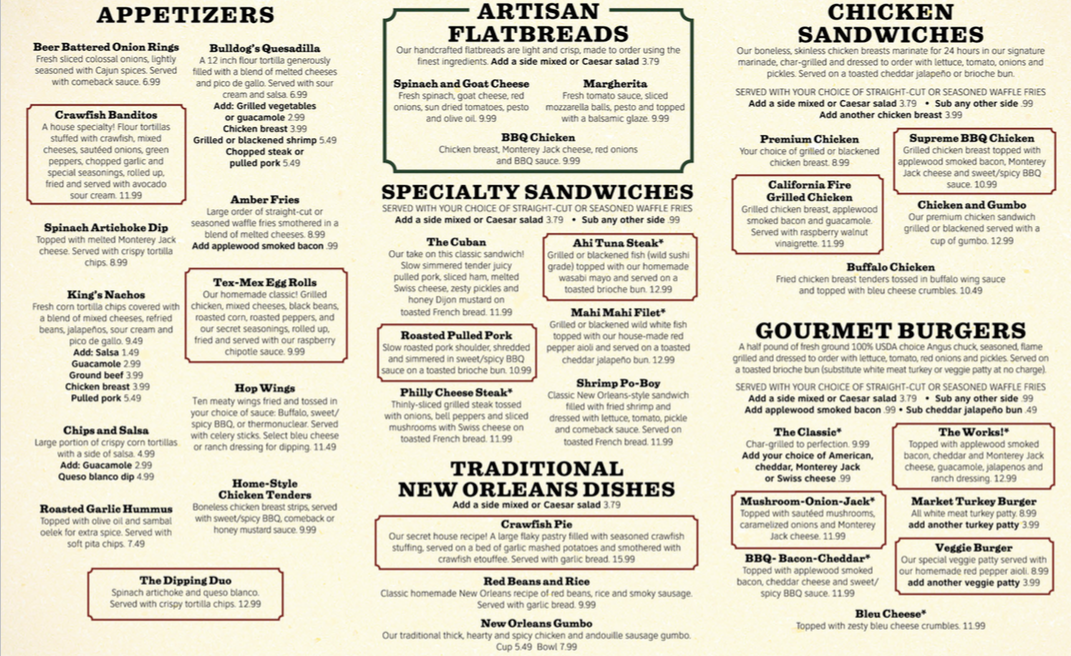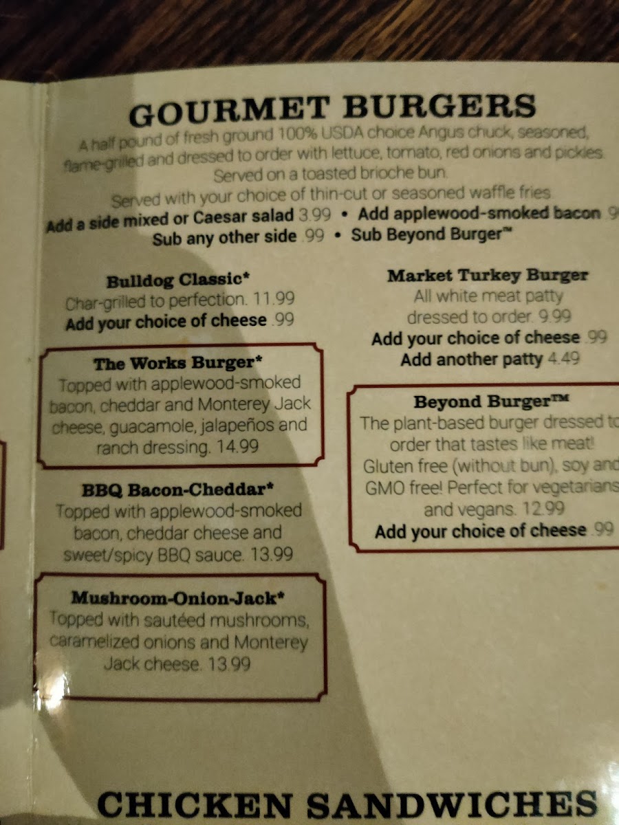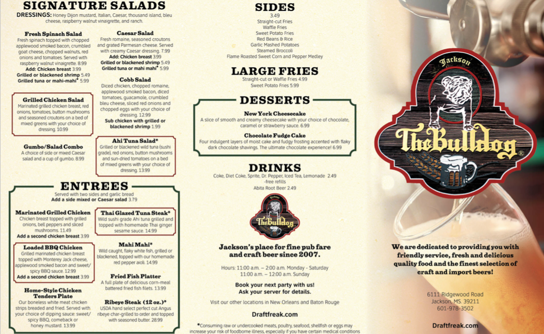 If you're searching for a hidden gem in Jackson, look no further than The Bulldog, Jackson. Nestled at 6111 Ridgewood Rd, this bustling eatery has garnered rave reviews for its vibrant atmosphere and expertly crafted menu. With a focus on hearty sandwiches, their Cali Fire Grilled Chicken and Pulled Pork Sandwiches, priced between $14.99 and $18.74, are standout options that deliver robust flavors. For those craving something different, the Beyond Burger and Loaded BBQ Chicken keep the palate intrigued, with prices ranging from $17.49 to $21.24.